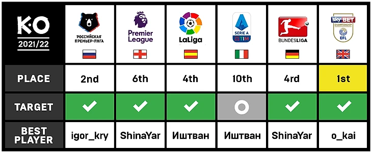 В последнем туре 6-0 с бедными Михеем и Джуманджи (обоих жаль) гарантировали нам заслуженный промоушн. 4 позиция и место в ̶Л̶Ч̶ ̶ Примере на будущий сезон — дотерпели.