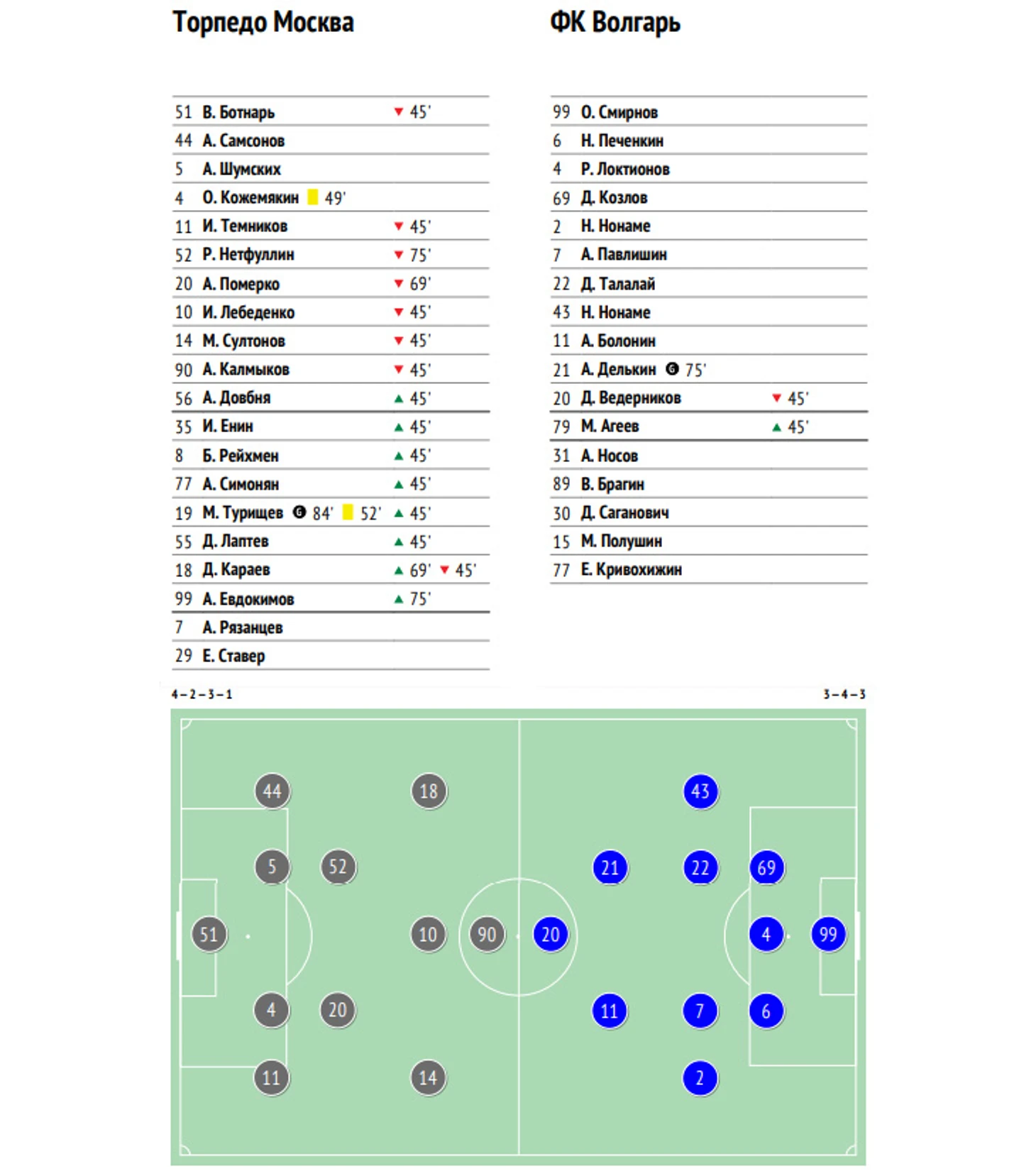 «Волгарь» - «Торпедо» - 1:1 (0:0) Голы: Делькин, 75 (1:0), Смирнов, 85 - в свои ворота (1:1). «Волгарь» (стартовый состав): Смирнов, Печёнкин, Локтионов, Козлов, Носов, Ведерников, Павлишин, Талалай, Агеев, Болонин, Делькин. «Торпедо»: Ботнарь (Довбня, 46), Самсонов, Шумских, Кожемякин, Темников (Турищев, 46), Померко (Караев, 70), Нетфуллин (Евдокимов, 75), Караев (Енин, 46), Султонов (Симонян, 46), Лебеденко (Рейхмен, 46), Калмыков (Лаптев, 46). 28.06.2022 (вторник). Начало - 17:30. Раменское. Стадион «Сатурн».