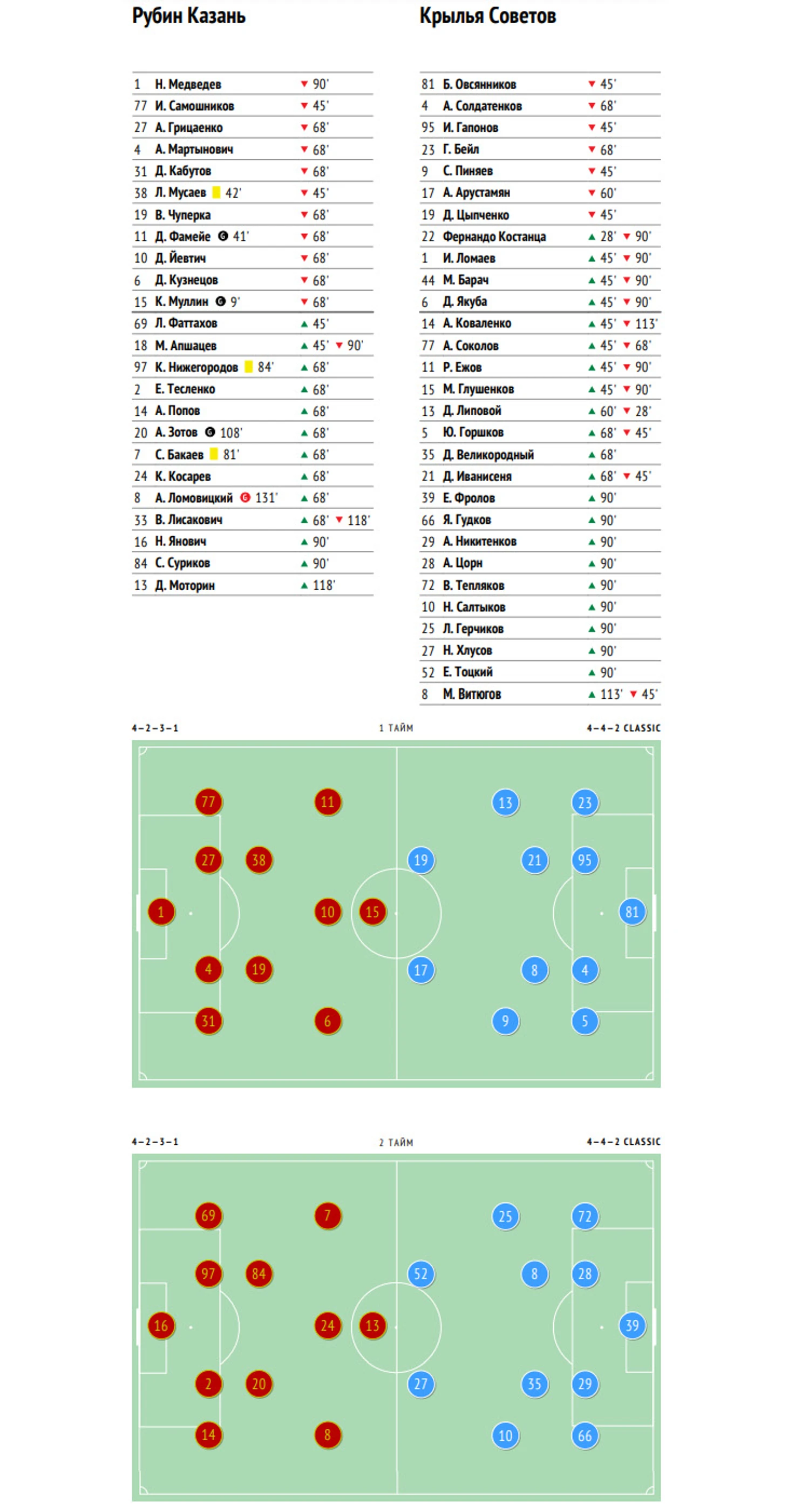 «Рубин» — «Крылья Советов» — 3:1 (2:0) Голы: Муллин, 9 (1:0). Фамейе, 40 (2:0). Зотов, 107 (3:0). Ломовицкий, 131 — в свои ворота (3:1). «Крылья Советов»: Овсянников (Ломаев, 46. Фролов, 90), Солдатенков, Гапонов (Барач, 46), Горшков (Якуба, 46), Бейл (Гудков, 90), Витюгов (Ежов, 46. Тепляков, 90), Липовой (Костанца, 28. Герчиков, 90), Пиняев (Глушенков, 46. Салтыков, 90), Иванисеня (Соколов, 46. Великородный, 69), Цыпченко (Коваленко, 46. Хлусов, 90), Арустамян. Предупреждения: Мусаев, 42. Бакаев, 82. Нижегородов, 84. 28.06.2022 (вторник). Начало – 15:00. Казань. Стадион «Ак Барс Арена».
