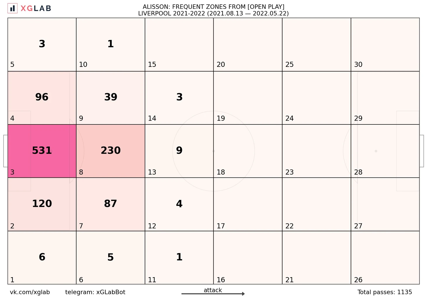 При подчистке за своими защитниками важно не только лишить соперника момента, но и отдать точную передачу для сохранения владения мячом. Косвенно оценить это нам поможет карта зон сервиса XgLab. Карта показывает, откуда были сделаны передачи (без учета стандартных положений) на примере Алиссона в сезоне 2021/2022.