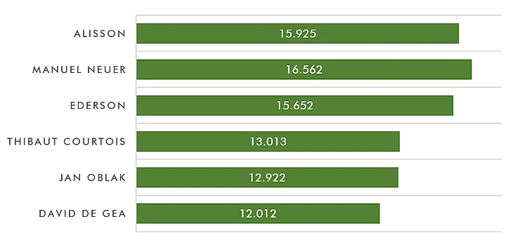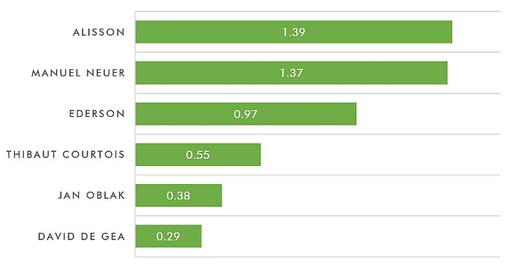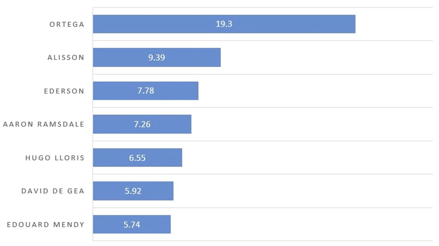 Штефан на порядок обходит остальных вратарей по этому статистическому показателю, но Алиссон все же располагается выше, чем все остальные вратари АПЛ.