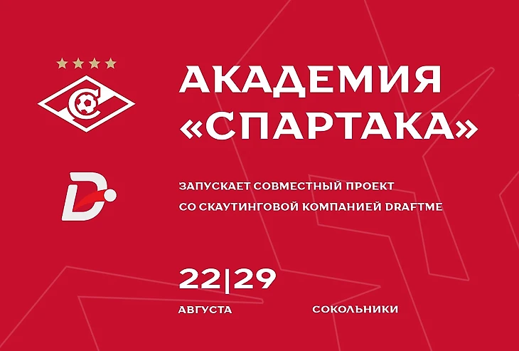 Офийиальный сайт «Спартака» сделал заявление, что клубная академия и скаутинговая компания DraftMe объявляют о начале сотрудничества, в рамках которого планируется проведение первого совместного просмотрового сбора в Сокольниках с 22 по 29 августа. Футболисты пяти возрастных категорий (U-12, U-13, U-14, U-15, U-16) пройдут подготовку к двум просмотровым матчам и сыграют со своими сверстниками из московских футбольных академий. На матчах будут присутствовать скауты «Спартака» и клубов-партнеров. Игроки, лучше всех проявившие себя на недельном просмотровом сборе, получат приглашение в Академию красно-белых или в клубы-партнеры. Кроме того, по итогам сбора каждый футболист получит оцифрованные аналитические данные двух матчей, а также будет внесен в базу данных красно-белых для отслеживания прогресса и возможного приглашения на просмотр в Академию «Спартак» имени Фёдора Черенкова.