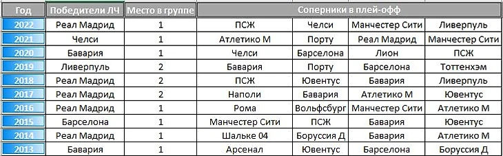В первую очередь я предлагаю обратиться ко всем победителям Лиги Чемпионов за последние 10 лет, проследив их путь до победы и понять общую закономерность. Есть ли она в принципе и случались ли победы вопреки или по удачному стечению обстоятельств? Каждый ли год побеждал сильнейший?