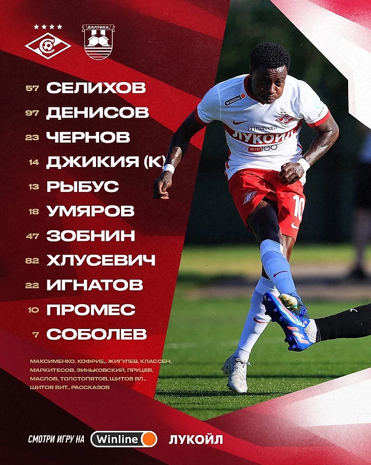 Сегодня красно-белые провели на своей тренировочной базе товарищеский матч против «Балтики» из Калининграда и победили со счетом 3:2. Преимущество спартаковцев в классе над «Балтикой» было заметно в первом тайме, а во втором команда заметно сбавила темп. «Спартак» под руководством нового главного тренера Гильермо Абаскаля провел этот матч в таком составе: Селихов (А.Максименко, 46), Денисов (Кофрие, 46), Умяров (Л.Классен, 46), Чернов (Н.Рассказов, 46), Джикия (А.Зиньковский, 46), Рыбус (Литвинов, 46), Зобнин (П.Маслов, 46), Хлусевич (Влад.Шитов, 65), Игнатов (Д.Пруцев, 46), Промес (Д.Маркитесов, 65), Соболев (И.Жигулев, 46). Два мяча забил Промес – это его второй дубль в товарищеских матчах, один Игнатов.