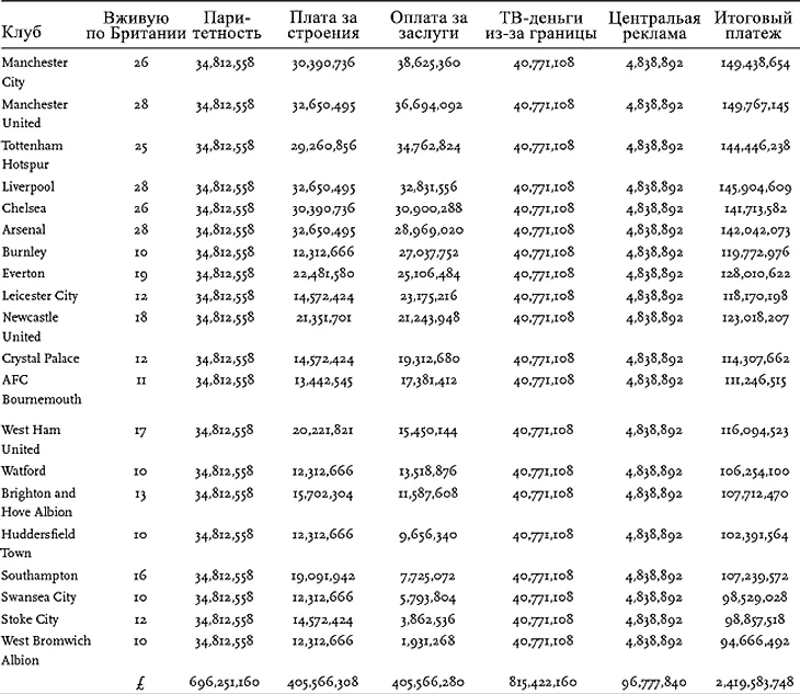 В таблице на следующих страницах показаны выплаты, произведенные Премьер-лигой клубам за сезон 2017/18.