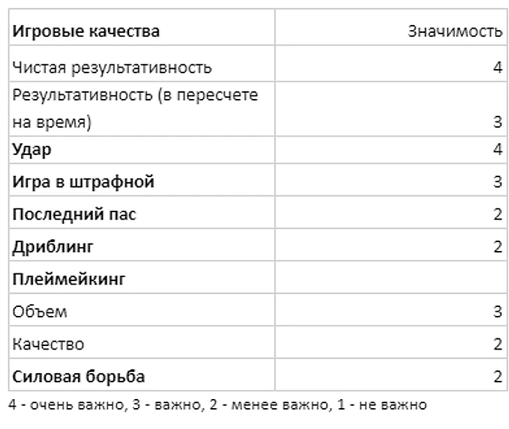 В третьих, зададим разную значимость статистических показателей для игроков разных позиций.