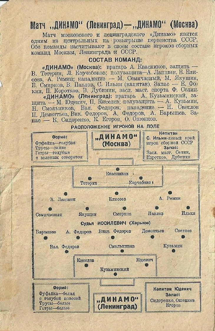 Среди московских динамовцев зрители снова увидели пятерку нападения - Семичасного, Якушина, Смирнова, Павлова, Ильина и других игроков, не раз защищавших честь советского спорта в международных встречах. Ленинградское "Динамо", напротив, сильно обновило состав своей команды, введя в нее семь молодых игроков. Отсутствовал на поле заслуженный мастер спорта Михаил Бутусов; болезнь помешала ему участвовать в игре.