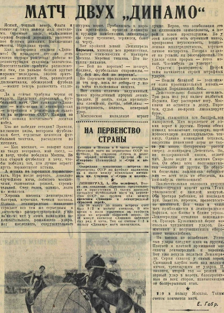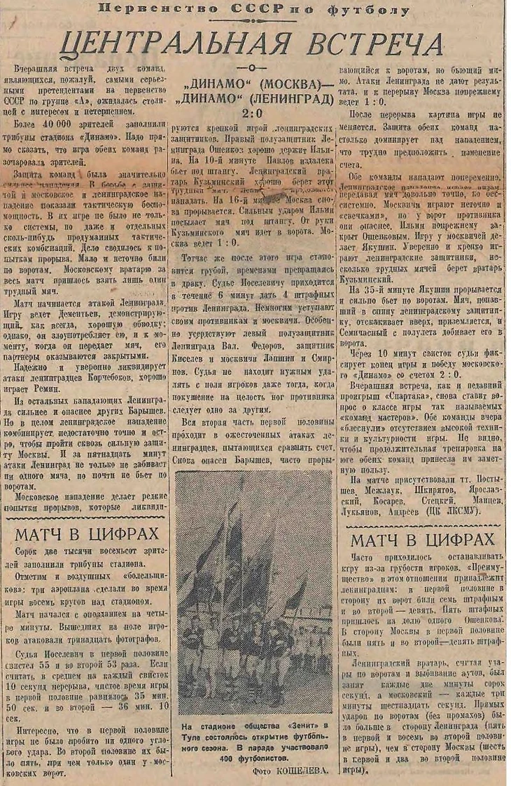 Стадион "Динамо" грандиозен: после реконструкции и постройки восточных трибун он вмещает около 100.000 зрителей. Общее протяжение всех рядов на трибунах равно 28, 5 километра. Мягкая зелень аккуратно подстриженного футбольного поля - будто по нему прошлись краской. Заботливо убраны обсаженные по сторонам цветами дорожки и аллеи, ведущие к трибунам. Отличный, культурный стадион! Встречу сильнейших футбольных команд - московского и ленинградского "Динамо" - вчера смотрели свыше 50.000 человек. Когда стрелки огромного циферблата, установленного над восточными трибунами, подошли к 6 часам, команды вышли на поле.