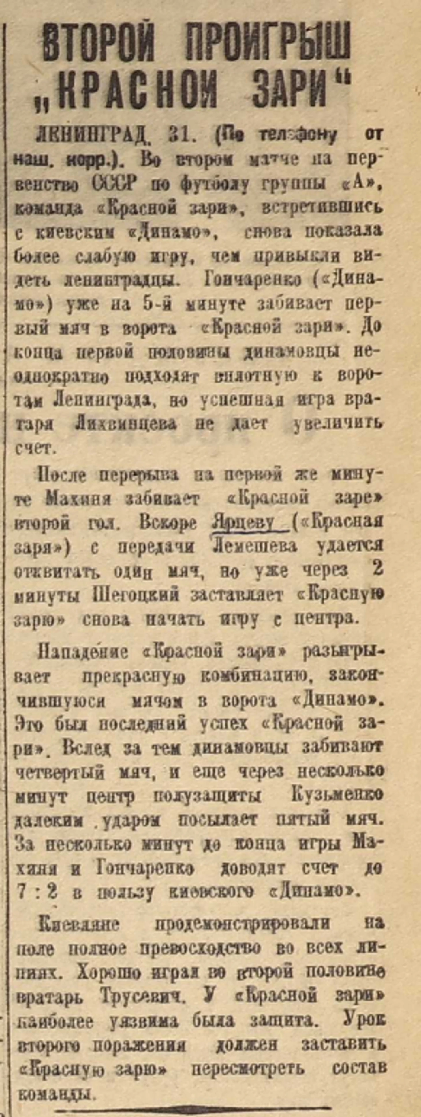 "Красная Заря" (Ленинград) - "Динамо" (Киев) - 2:7 (0:1) 31 мая 1936. Ленинград. Стадион "Красный треугольник". 15000 зрителей. Судья: Н.Корнеев (Москва). "Красная Заря": Л.Лихвинцев, В.Топталов, В.Григорьев, Д.Карев, В.Орешкин, А.Яблочкин, П.Григорьев, И.Смирнов, В.Лемешев, Н.Ярцев, Ф.Аксенов. "Динамо" К: Н.Трусевич, М.Волин, К.Фомин, Ф.Тютчев, И.Кузьменко, В.Гребер, В.Шиловский, П.Комаров, К.Щегодский, М.Гончаренко (П.Паровышников), Н.Махиня. Голы: 0:1 М.Гончаренко (5), 0:2 Н.Махиня (46), 1:2 Н.Ярцев (55, пенальти), 1:3 П.Комаров (57), 1:4 П.Комаров (77), 2:4 В.Лемешев (78), 2:5 Н.Махиня (80), 2:6 К.Щегодский (83), 2:7 И.Кузьменко (87). Удаление: Н.Ярцев.