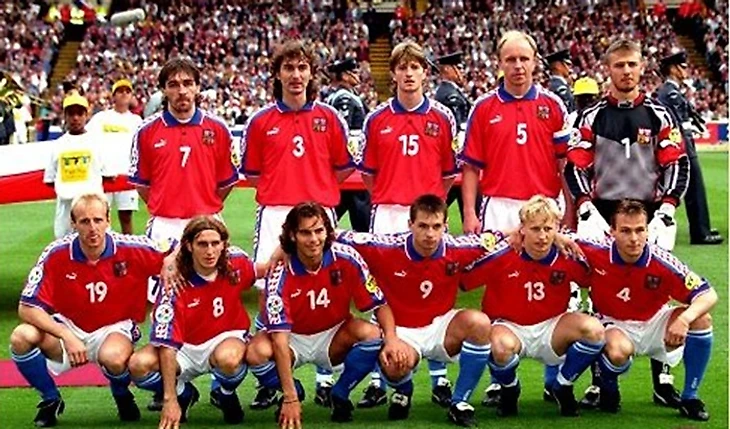 Сборная ЧЕХИИ - Вице Чемпион Европы-1996. Слева-напр, сидя: Карел Рада - Карел ПОБОРСКИ - Патрик БЕРГЕР - Павел Кука - Радек Бейбл - Павел НЕДВЕД. Стоя: Иржи Немец - Ян Сухапарек - Михал Хорнак - Мирослав Кадлец - Петр Коуба. (Перед Финалом, с Германией).