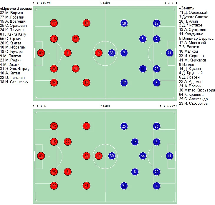«Зенит» - «Црвена Звезда» Сербия – 2:1 (0:0). 03.07.2022 (воскресенье). Начало – 20:00. Сочи. Стадион «Фишт». Судья: Кукуян (Сочи). «Зенит» (Санкт-Петербург): Одоевский (Кержаков, 46), Барриос (Кравцов, 73), Чистяков (Ловрен, 63), Алип (Скроботов, 89), Сутормин (Адамов, 63), Бакаев (Вендел, 46), Клаудиньо (Ерохин, 71), Дуглас Сантос (Круговой, 63), Малком (Кузяев, 46), И.Сергеев (Кассьерра, 71), Мостовой (Сандрачук, 78). «Црвена Звезда» (Белград): Борян, Пиччини (Родич, 53), Драгович, Эракович, Гобелич, Кангва (Станкович, 84), Срнич (Николич, 73), Канга, Павков (Катаи, 64), Букари (Иванич, 53), Мустафа (Бен-Набуан, 64). Голы: Мостовой, 53 (1:0). Кассьерра, 74 (2:0). Катаи, 80 (2:1). Наказания: Драгович, 32. Николич, 90+4 (предупреждения).