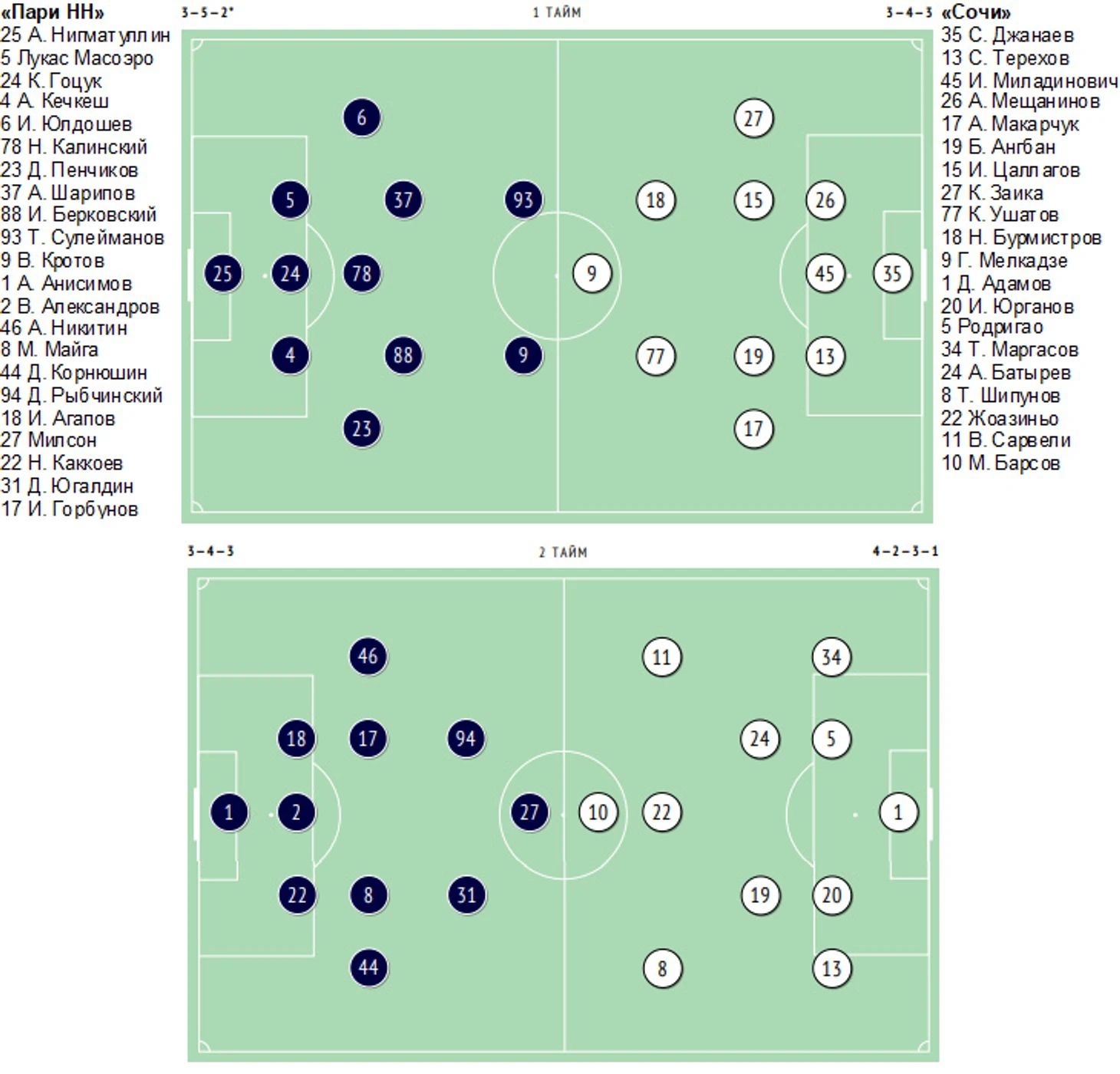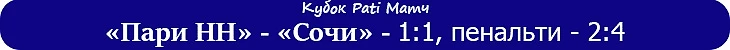 «Пари Нижний Новгород» — «Сочи» — 1:1 (0:0), пенальти — 2:4 01.07.2022 (пятница). Начало – 20:00. Москва. Стадион «ВЭБ Арена». «Пари Нижний Новгород»: Нигматуллин (Анисимов, 46), Гоцук (Горбунов, 84), Пенчиков (Александров, 46), Кечкеш (Агапов, 62), Масоэро (Корнюшин, 46), Юлдошев (Рыбчинский, 46), Калинский (Каккоев, 74), Шарипов (Майга, 46), Кротов (Никитин, 46), Берковский (Югалдин, 74), Сулейманов (Милсон, 62). «Сочи»: Джанаев (Заболотный, 46), Терехов, Цаллагов (Адамов, 46), Заика (Маргасов, 46), Миладинович (Юрганов, 46), Мещанинов (Родригау, 46), Бурмистров (Жоаузинью, 46), Макарчук (Шипунов, 46), Ангбан, Ушатов (Сарвели, 46), Мелкадзе (Барсов, 46). Предупреждение: Терехов, 45. Голы: Гоцук, 52 (1:0). Шипунов, 56 (1:1). Серия пенальти: Маргасов — 0:1. Агапов — 1:1. Жоаузинью — 1:2. Рыбчинский — 1:2 (вратарь). Ангбан — 1:3. Милсон — 2:3. Терехов — 2:4. Никитин — 2:4 (вратарь).