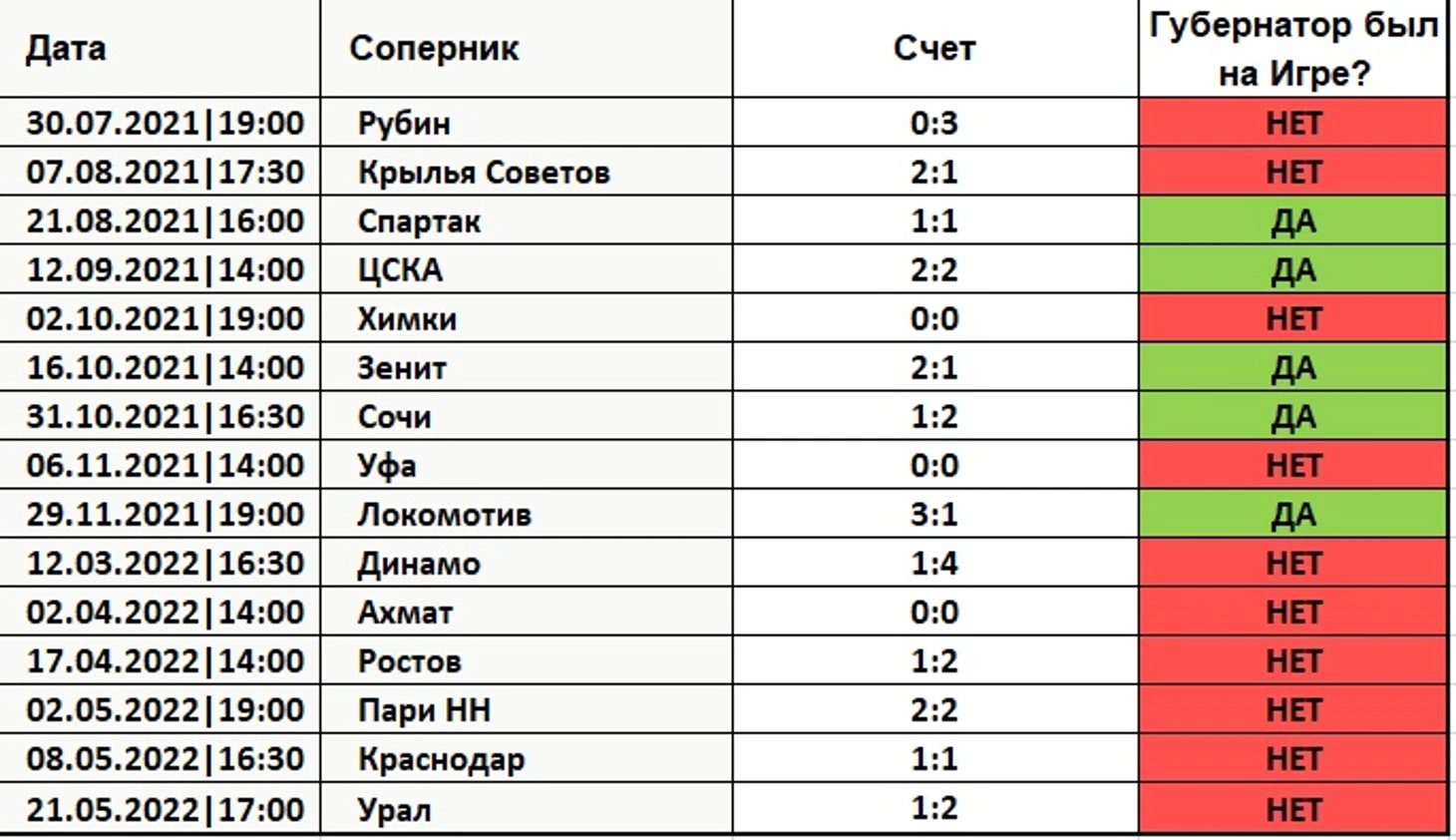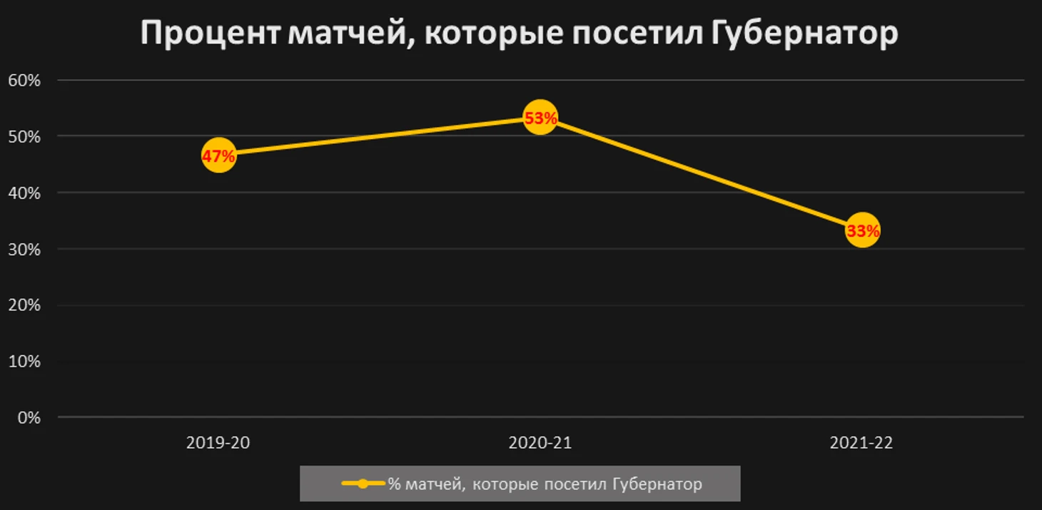 1. Губернатор стал реже посещать матчи – факт.В сезоне 2020/21 и 2019/20 было много ковидных ограничений, но даже тогда губернатор посещал матчей больше, чем в нынешнем сезоне, когда эти ограничения стали потихоньку отменять.