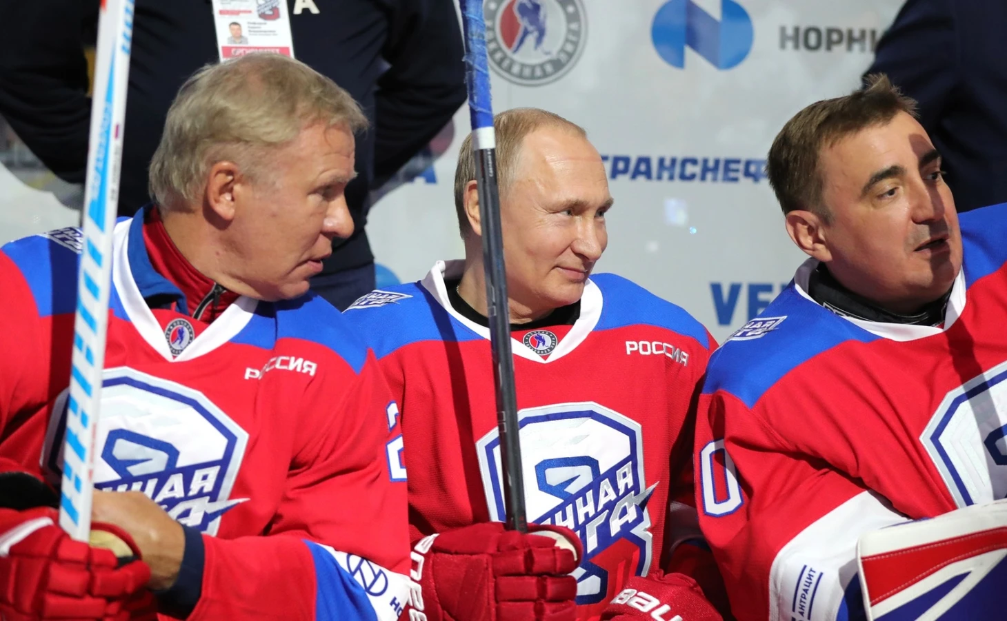 Владимир Путин, Алексей Дюмин, Вячеслав Фетисов на матче «Ночной Хоккейной Лиги».