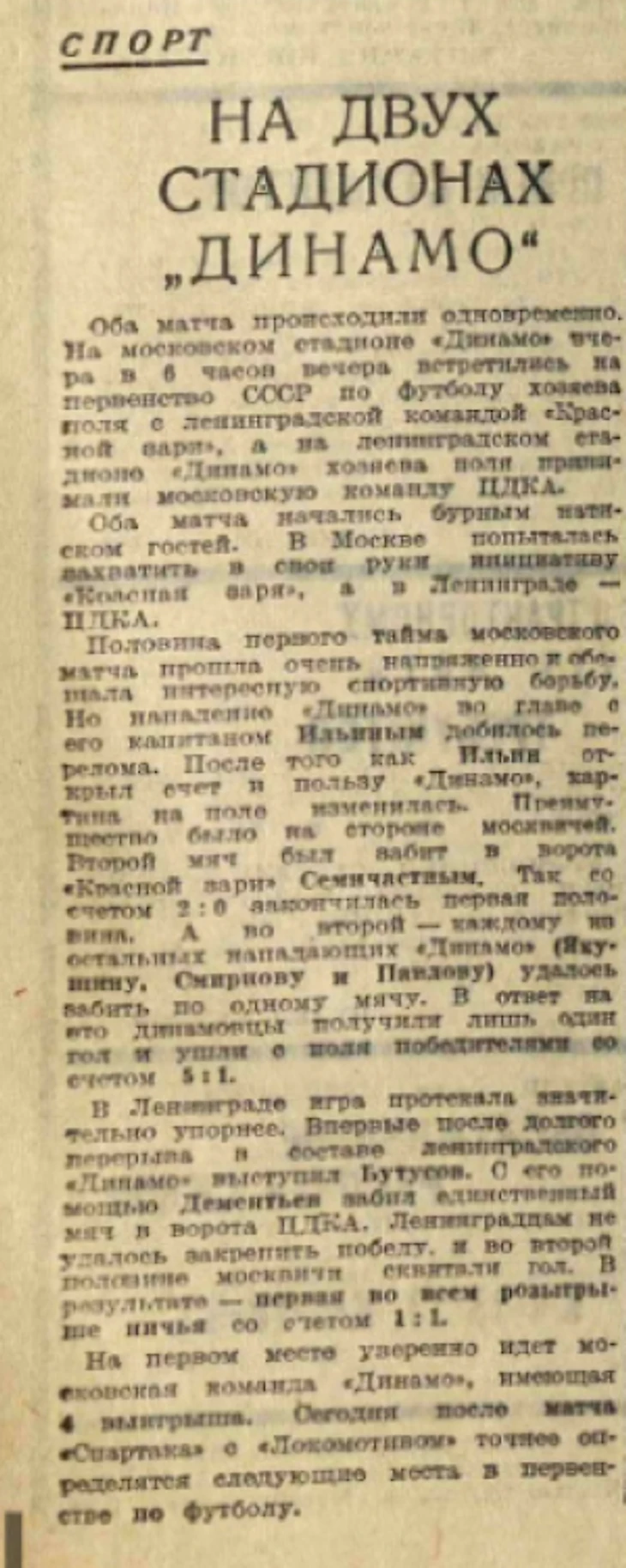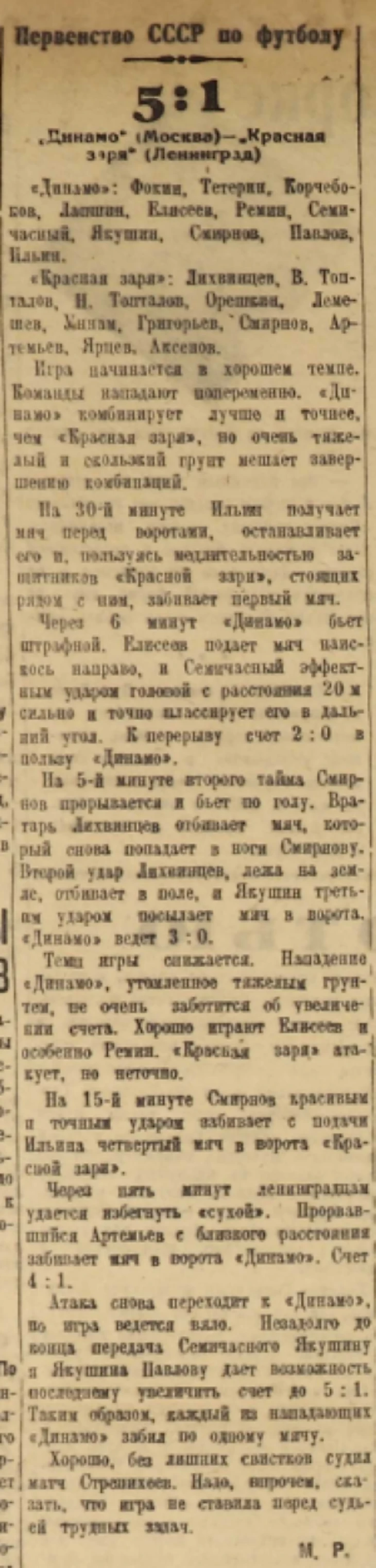 Первые полчаса "Красная заря" держалась стойко, а временами даже энергично нападала на динамовцев, которые вели игру уверенно и хладнокровно. Мяч, посланный в сетку "Красной зари" динамовцем Ильиным, как бы послужил сигналом для перехода в наступление. До конца игры каждый из остальных нападающих "Динамо" (Семичастный, Якушин, Смирнов и Павлов) также забил по одному мячу. Исключительно красив был гол, забитый Семичастным головой с большого расстояния.