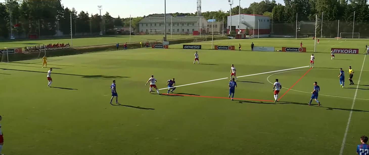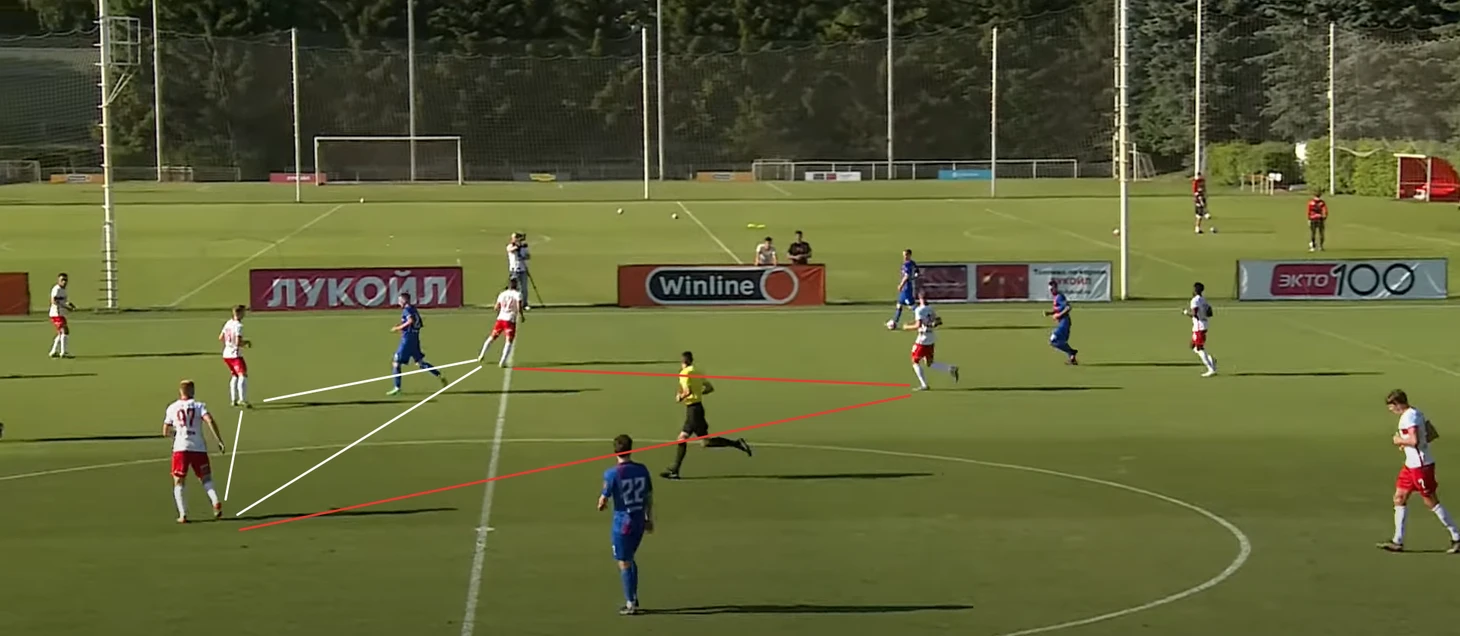 Схема 4-3-1-2, из-за плотности в середине поля, приводит к перекосу на один из флангов. В случае Спартака акцент сделан на левый фланг. Рыбус в разы лучше Хлусевича в розыгрыше мяча, к тому же, Промесу удобнее играть ближе к левому флангу из-за рабочей правой ноги
