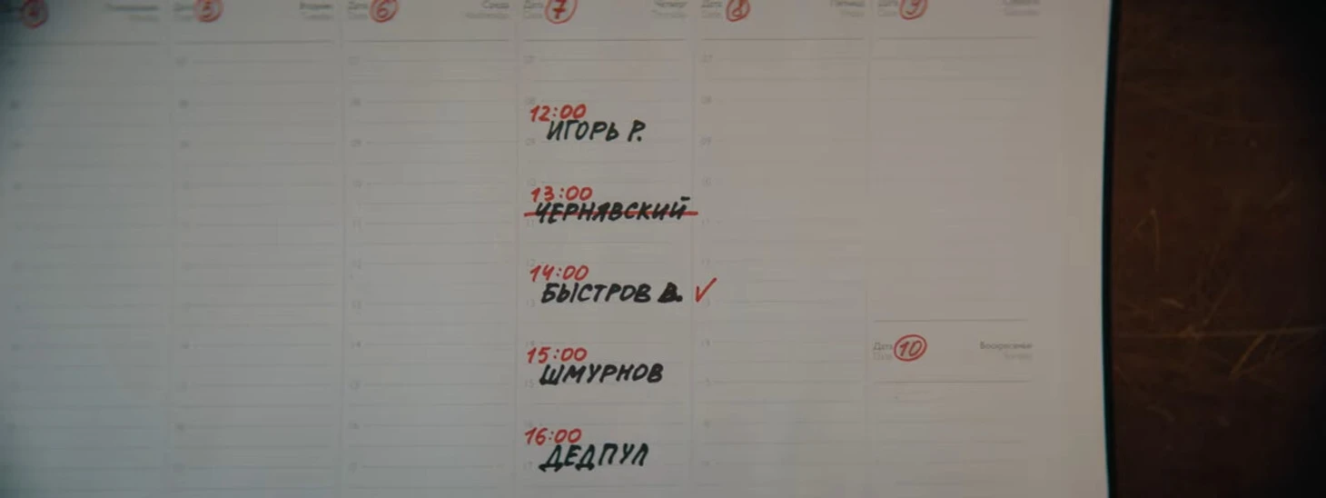 Последнее растворяется в звонке некоего Владимира секретарше психотерапевта. Им оказывается Владимир Быстров – его имя в книге «пациентов» вместе с Игорем Р. (видимо, Рабинером), Чернявским (видимо, Глебом – его сеанс отменен), Шмурновым и Дедпулом (видимо, Артемом Дзюбой).