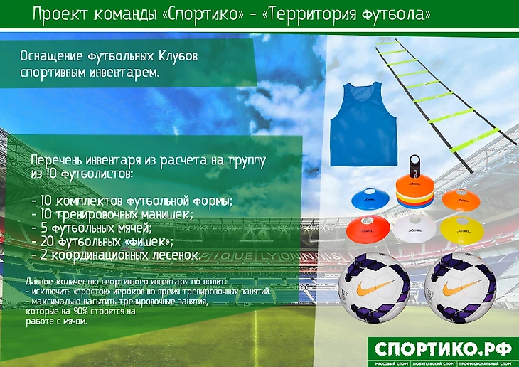 Перечень минимального набора спортивного инвентаря, которым будет обеспечен каждый созданный футбольный клуб - мячи, манишки, фишки, координационные лесенки!