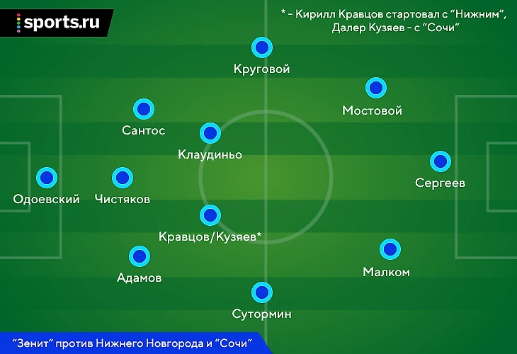 Схема обновилась благодаря возвращению Нуралы Алипа (оба матча начал в старте) и универсальности Алексея Сутормина (остался крайним защитником) с Дугласом Сантосом (вернулся на левый фланг). Семак попробовал несколько сочетаний в полузащите: против ЦСКА стартовал с треугольником Барриос-Клаудиньо-Кузяев, а в Сочи» вместо Кузяева выпустил Бакаева.