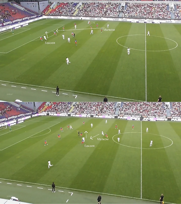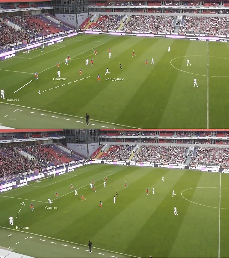 Но ключевая цель для новичка «Зенита» – найти контакт с восьмерками и крайними защитниками. Бакаев интересно сыграл с ЦСКА: создавал ширину (Клаудиньо и Дуглас заполняли середину – пример в прошлом абзаце), вовремя заужал, освобождал пространство для партнеров, старался не дублировать позиции и правильно меняться местами.