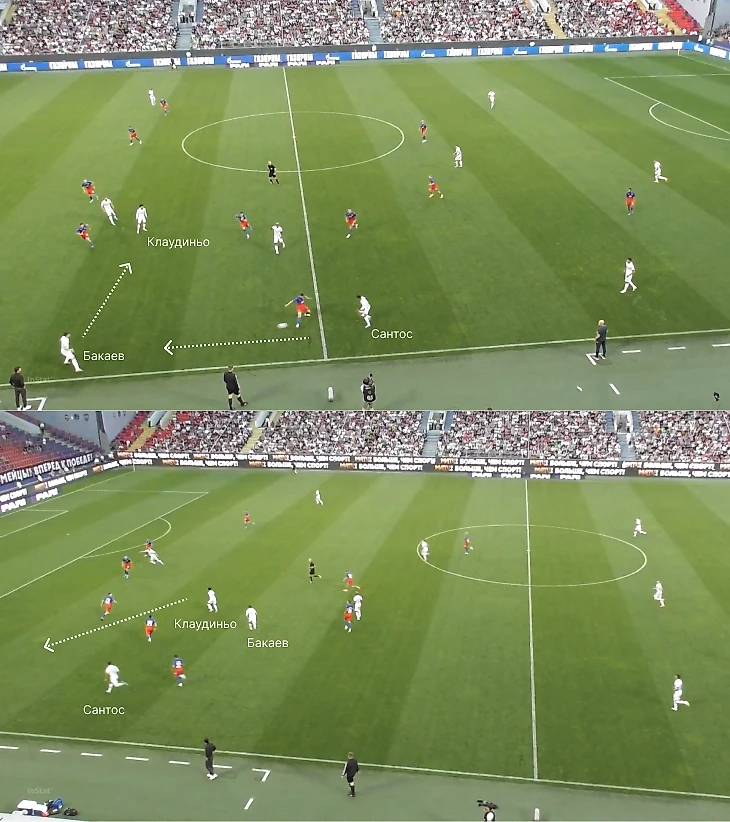 Преимуществу также способствовали треугольники между Дугласом, Клаудиньо и Мостовым/Бакаевым (вингер отвечал за ширину, менялся позициями с восьмеркой и освобождал фланг защитнику).