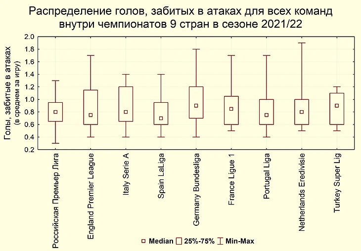 По медиане голов, забитых в атаках (в среднем за игру), лидирует Бундеслига Германии и Супер Лига Турции. Для распределения Российской Премьер-Лиги характерен очень малый минимум (нижний ус диаграммы), отражающий, что команда Нижний Новгород, забивавшая всего 0,3 гола в результате атак, имеет самый низкий этот показатель в сравнении со всеми 170 командами 9 чемпионатов. Максимальный уровень, показанный в РПЛ Зенитом и Сочи – 1,3 гола в результате атак (в среднем за игру), также ниже, чем у лидеров топ-5 европейских чемпионатов. Голы с игры – один из зрелищных компонентов футбола, однако в нем российский футбол несколько менее ярок, чем чемпионаты других стран.
