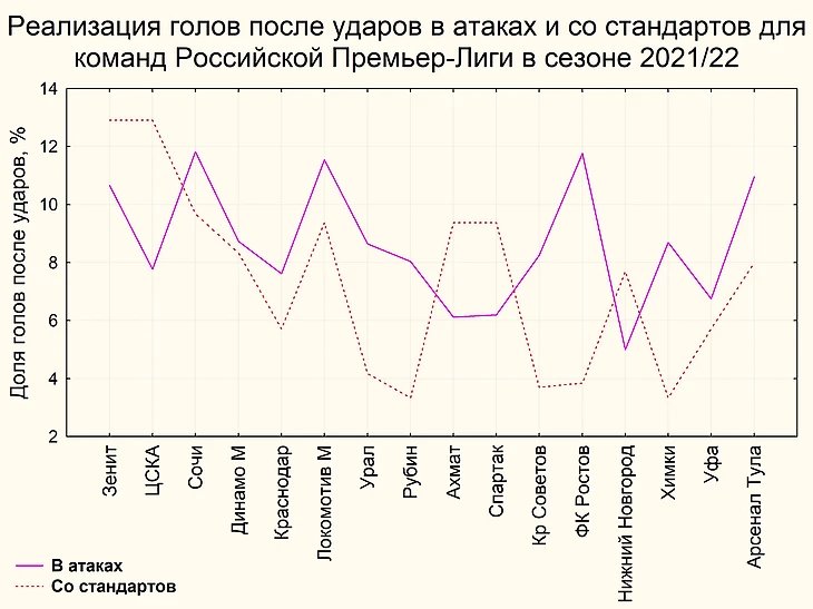 На третьем рисунке рассмотрим реализацию ударов в голы для 16 клубов Российской Премьер-Лиги. Наилучшая реализация ударов в результате проведенных атакующих действий наблюдается у Сочи, Ростова и Локомотива М - 11,5–11,8%. Самая высокая реализация ударов со стандартов отмечается у Зенита и ЦСКА – 12,9%. У некоторых команд реализация ударов со стандартов выше, чем в результат атак, это Зенит, ЦСКА, Ахмат, Спартак и Нижний Новгород. У остальных команд выше реализация ударов, совершенных в результате проведенных атак.