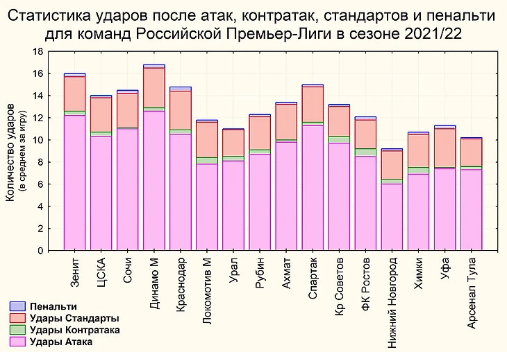 На первой диаграмме можно видеть количество ударов (в среднем за игру) для всех 16 команд Российской Премьер-Лиги по данным сезона 2021/2022. Разным цветом приведены показатели ударов, совершенных в разных ситуациях: после атак, контратак, со стандартов и пенальти. Суммарная высота столбика показывает общее количество разных ударов (в среднем за игру), совершенных каждой командой.