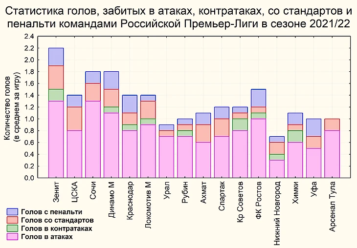 Схожее ранжирование команд Российской Премьер-Лиги можно видеть и по забитым голам, представленное на второй диаграмме. Больше всех голов забивали Зенит – 2,2 в среднем за игру, Сочи и Динамо М – 1,8 в среднем за игру. Они самые результативные команды чемпионата Российской Премьер-Лиги сезона 2021-22. Меньше других забили голов Нижний Новгород и Урал. У всех команд самая значительная часть голов забито в результате атак. Но некоторые достаточно эффективно реализуют и стандартные положения. Больше всех голов со стандартов забивали Зенит и ЦСКА – 0.4 в среднем за игру. Еще по 0,3 гола в среднем за игру забивали с пенальти Зенит, Динамо М, Краснодар, Ростов и Уфа. Редко забивают голы в результате стандартных положений Урал, Рубин, Крылья Советов, Ростов, Химки. Меньше всего российские команды забивают голов после контратак. Лучше других реализуют контратаки Зенит, Крылья Советов и Химки – по 0,2 гола в среднем за игру. Некоторые команды в сезоне 2021/22 РПЛ не забили с контратак ни одного гола, это ЦСКА, Сочи, Урал, Ахмат, Спартак, Уфа, Арсенал Тула.