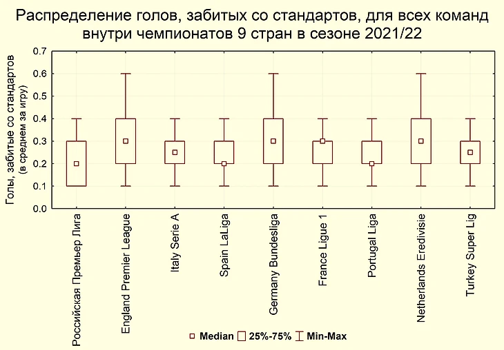 На шестой диаграмме представлены распределения голов, забитых со стандартных положений. Можно видеть, что по этому показателю лидирует Английская Премьер-Лига, Бундеслига и Эредивизион, в которых голов со стандартов забивается больше, чем в чемпионатах других стран. Для Российской Премьер-Лиги медиана голов со стандартов составляет всего 0,2 (в среднем за 90 минут). Кроме того, 5 команд РПЛ в сезоне 2021/2022 показали крайне низкий уровень - всего 0,1 гола со стандартов за игру, поэтому на диаграмме нижний квартиль совпадает с минимумом. Думается, что низкие значения этого показателя для значительной части российских команд также могут приводить к недостаточной зрелищности игры в ряде матчей Российской Премьер-Лиги.