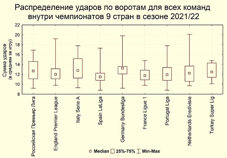 Теперь спроецируем основные рассмотренные показатели не только на Российскую Премьер-Лигу, но и еще на 8 европейских чемпионатов по результатам сезона 2021/22. На четвертой диаграмме можно видеть распределение ударов для команд внутри чемпионатов различных стран. Медиана суммы ударов для команд РПЛ составляет 12,7 (в среднем за игру) и находится примерно на уровне, схожем с другими чемпионатами. Несколько выше медиана ударов только в немецкой Бундеслиге. Распределение ударов в командах Российской Премьер-Лиги достаточно симметричное, это означает, что уровень команд равномерно изменяется от верхней к нижней части турнирной таблицы. Для Английской Премьер-Лиги, Бундеслиги Германии и Эредивизиона Нидерландов наблюдается отчетливая асимметрия распределения, показывающая, что в каждом из этих турниров есть по 1-3 команды, которые значительно превосходят остальные по этому показателю. В Англии больше всех ударов наносят Ливерпуль и Манчестер Сити, в Бундеслиге – Бавария, в Нидерландах – Аякс, ПСВ Эйндховен и Фейеноорд. Наиболее узкий диапазон распределения ударов отмечается для Лиги 1 Франция и Супер Лиги Турции, в каждом из этих чемпионатов уровень команд наиболее выровнен.