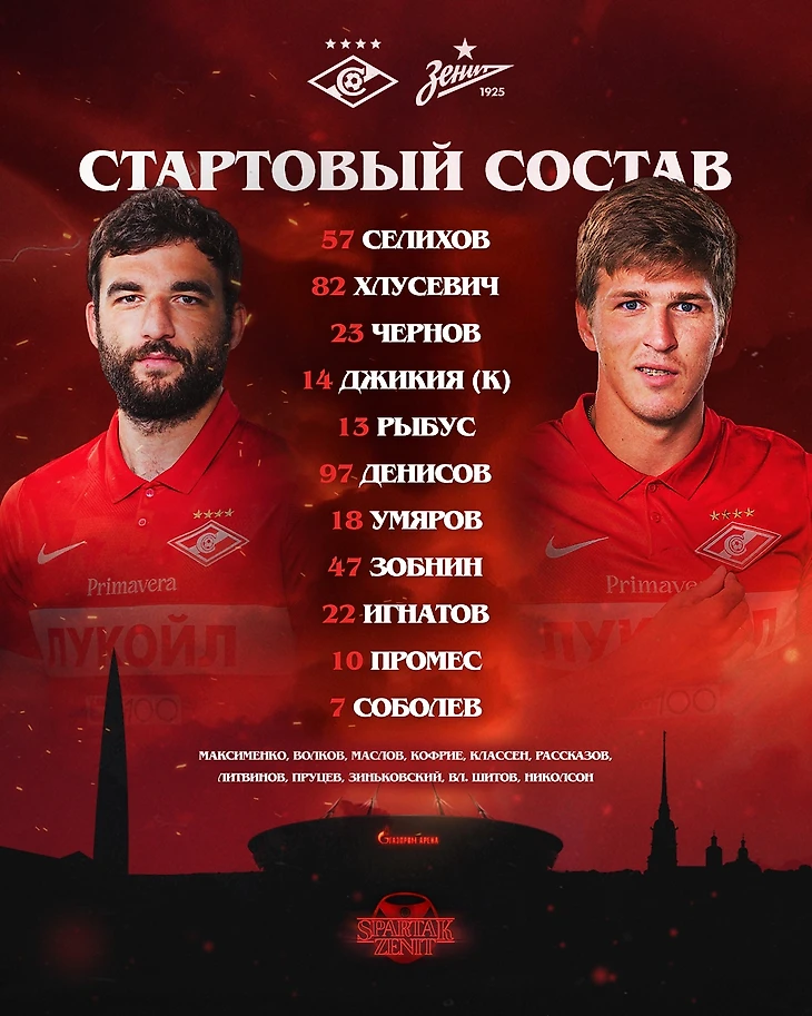 С первых минут сыграют: Селихов, Хлусевич, Чернов, Джикия (к), Рыбус, Умяров, Денисов, Зобнин, Игнатов, Промес, Соболев.