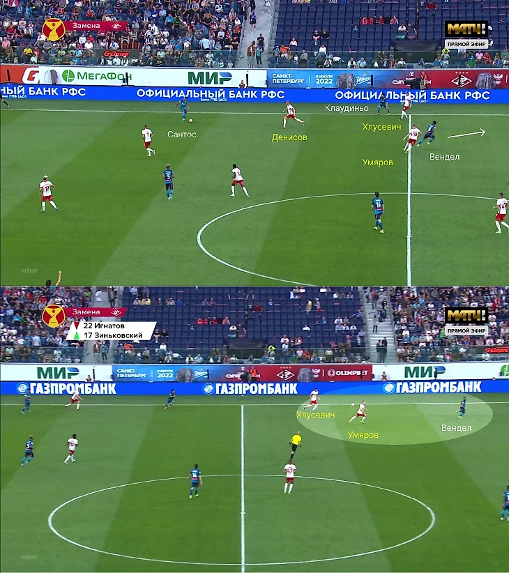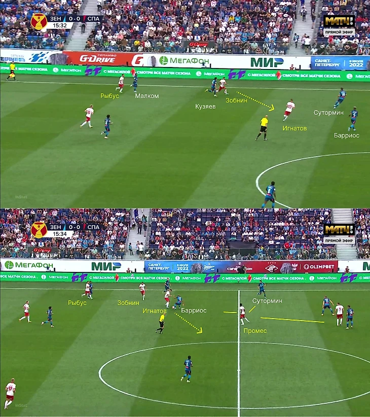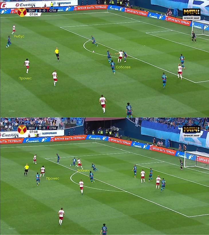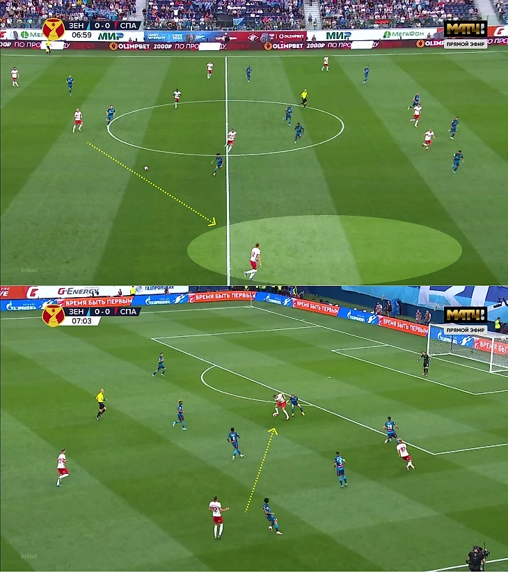«Зенит» адаптировался под «Спартак» узким расположением вингеров (часто оставались в зонах между восьмерками и крайними защитниками «Спартака», а затем ориентировались по мячу). Петербуржцы пользовались сыростью новой системы «Спартака» – периодически высокое давление по разыгрывающим приносило успех и тормозило начало атак, несмотря на некоторый структурный хаос (Барриос регулярно оставался один против двоих).