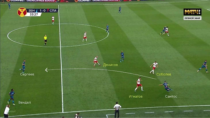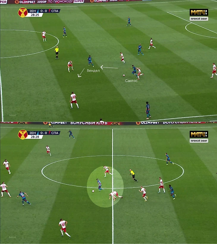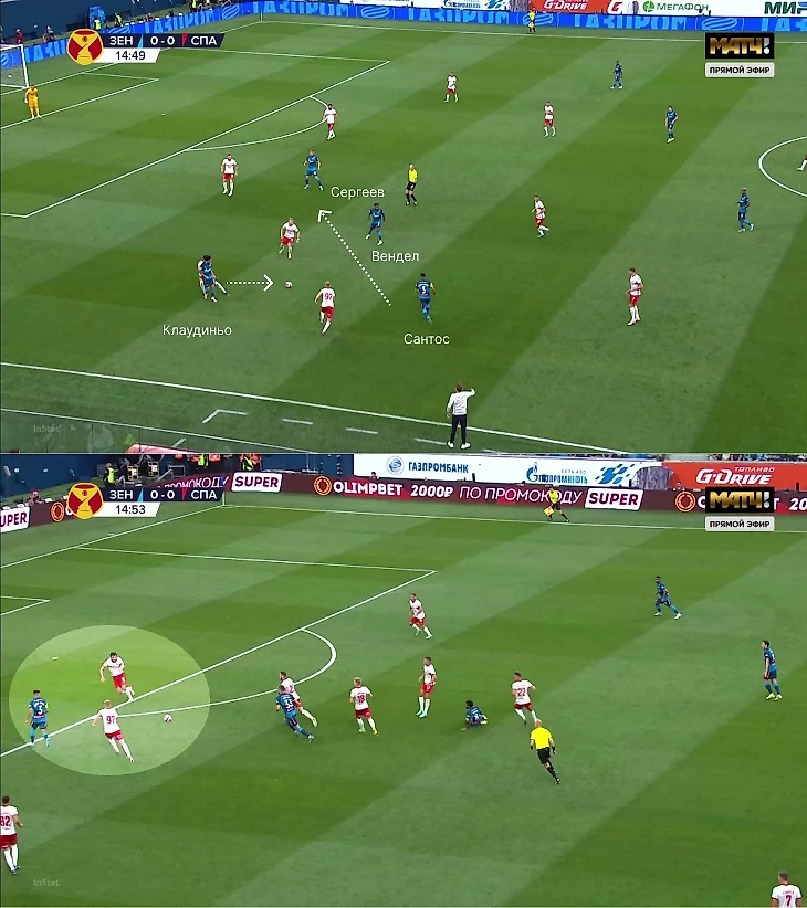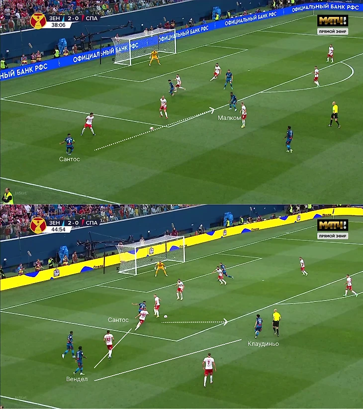 Сантос стал главным звеном в прохождении давления. Его ценность в атаке феноменальна. Первый голевой момент «Зенита» случился благодаря широкой позиции бразильца (его не успел накрыть Хлусевич) и игре в касание – Сантос отрезал защитников «Спартака», и Клаудиньо опасно навесил (Селихов ошибся на выходе, но спас после удара Кузяева).