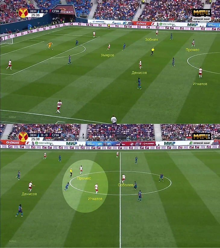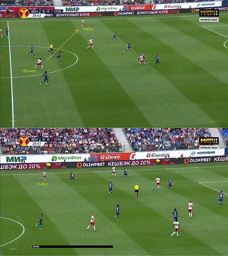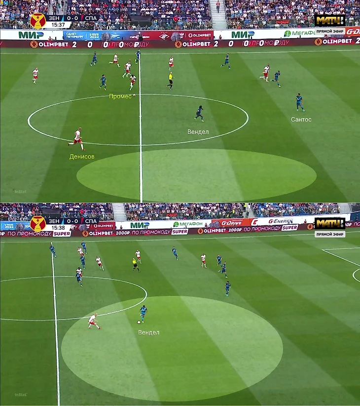 Когда Промес получил мяч, «Спартак» получил почти идеальный расклад: практически весь «Зенит» был сгруппирован на одном фланге (обратите внимание на позиции Сантоса и Вендела), а справа включались Денисов и Хлусевич (его нет в кадре, он обязан вбегать в таких ситуациях), но Квинси ошибся в передаче – мяч забрал Вендел.