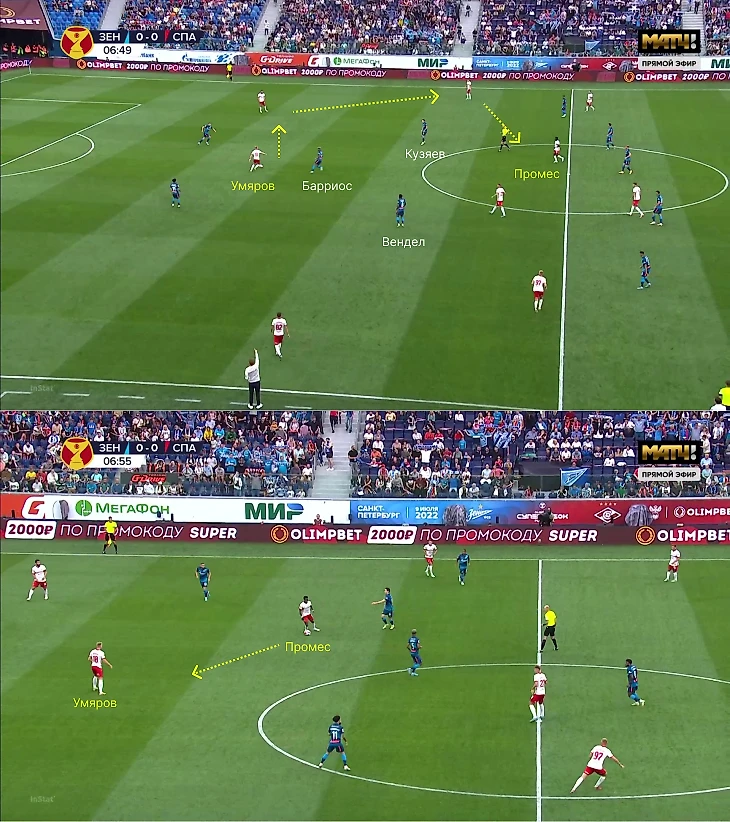 Например, в начале матча «Спартак» прошел первую фазу прессинга через роли Умярова и Промеса: Наиль воспользовался поздним стартом Барриоса, а Квинси выскочил в глубину и вернул мяч партнеру.