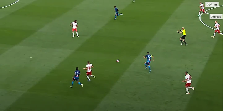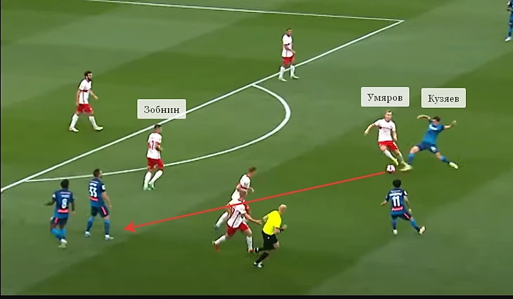 Обратите внимание на действия опорников Спартака. Умяров закрывает траекторию для передачи Кузяеву, но чем же в этом моменте занимается Зобнин? Он никого не кроет и не вступает в отбор. В этом моменте все винят Умярова, но меня намного сильнее пугает инертность Зобнина. Кроме того стоит конечно же отметить великолепный удар Сергеева. Он сам, наверное, не верил, что попадет.