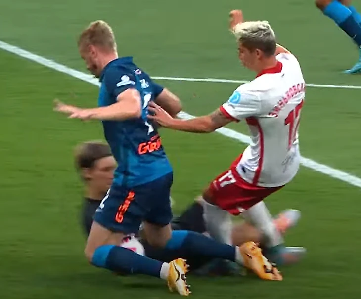 В моменте с третьим голом уже намного сложнее. Дело в том, что позицию Умярова можно объяснить стремлением одновременно перекрыть траекторию возможного удара Клаудиньо и играть по Венделу. Клаудиньо не ударил, а вот Вендел забил.