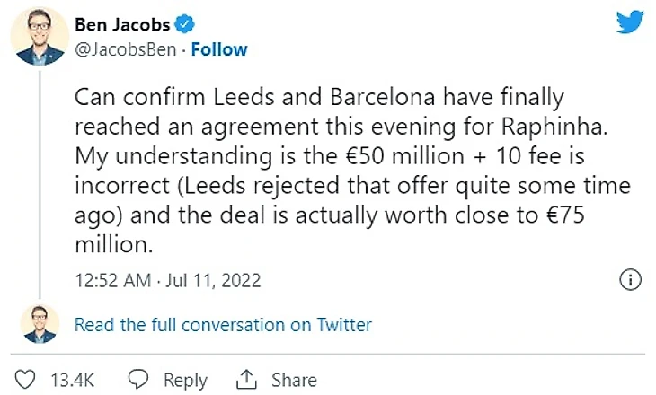 «Могу подтвердить, что «Лидс» и «Барселона» сегодня наконец достигли соглашения по Рафинье», — написал Бен Джейкобс в Твиттере.