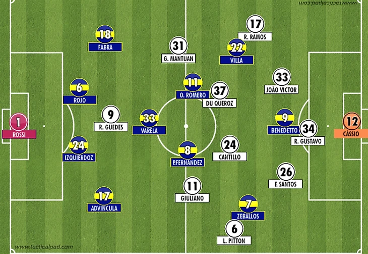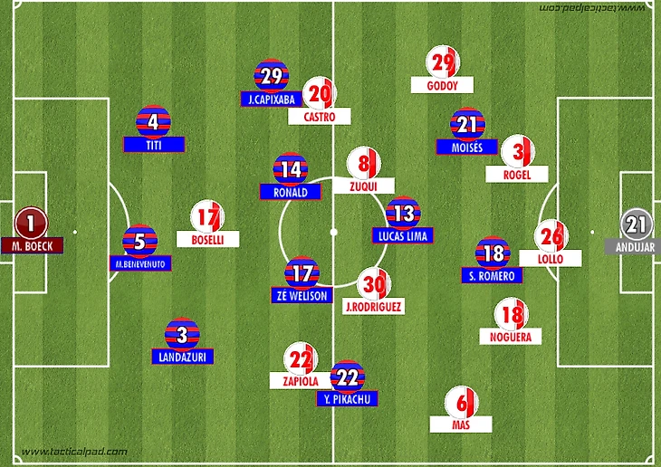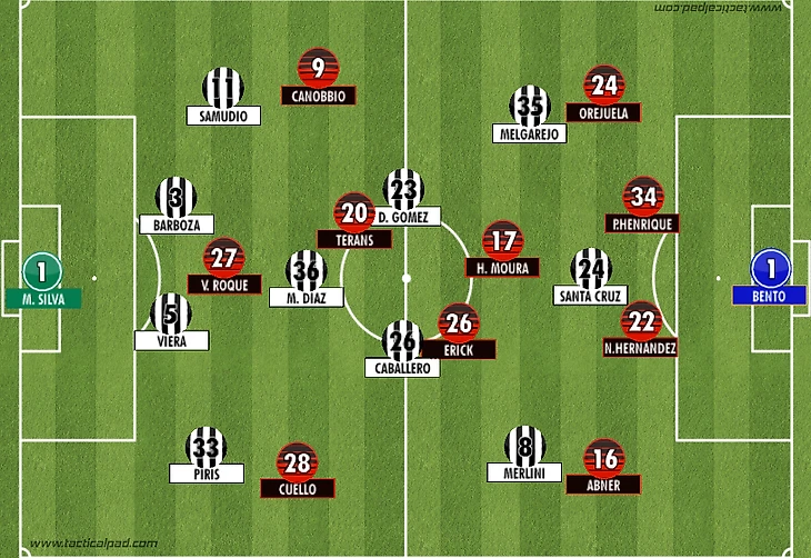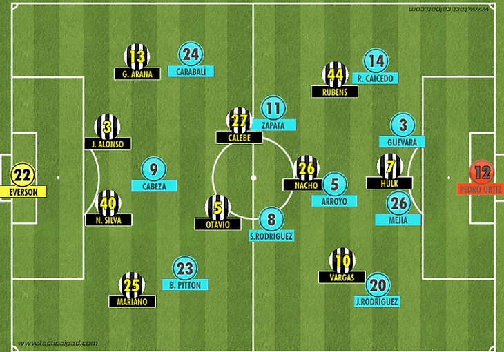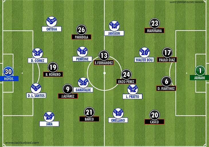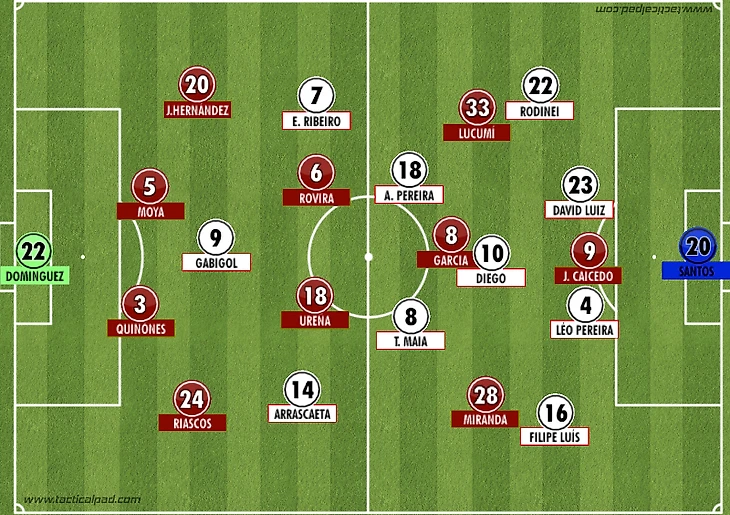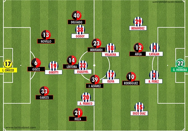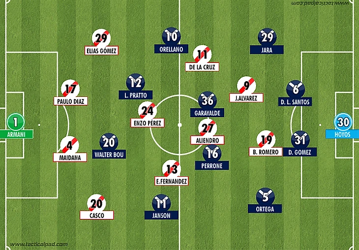 Марсело Гальярдо сделал много изменений в команде по сравненю с тем кого он выпустил на поле в 1-й игре. Де ла Крус вернулся после травмы вместо Барко. Маммана, Давид Мартинес и Парадела сели в запас. Каско играл справа, а Элиас Гомес вышел слева. Престарелый Майдана вышел в защите, а Алиендро в центре поля. Алешандре Медина сохранил полностью победный состав.