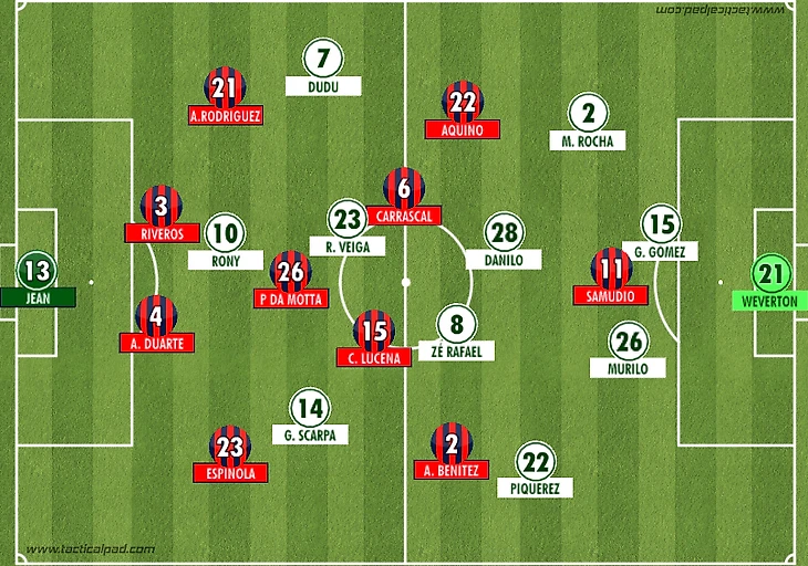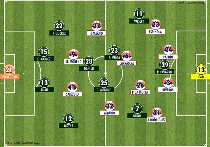 Абел Феррейра добившись разгрома в первом матче, на ответку выставил полуторный состав. Маркос Роша, Мурило, Зе Рафаэл, Густаво Скарпа и Рони остались на скамейке запасных. Вместо них вышли Майке, Луан, Габриэл Менино, Уэсли и Рафаэл Наварро. «Чики» Арсе выбрал же более агрессивный, атакующий состав по сравнению с первой игрой. Появились Марсело Морено и Галеано, а Патиньо вернулся в оборону.