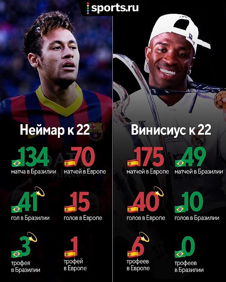 Сколько лет к 22 годам играл в Европе Неймар и сколько Вини?