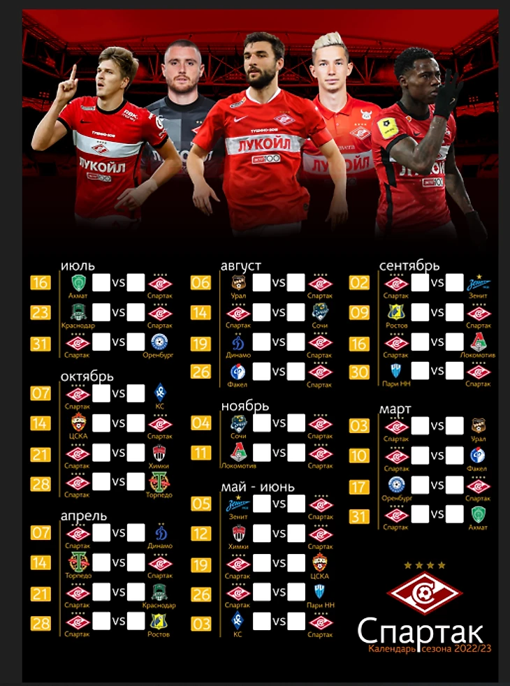 Подготовил календарь Спартака, чтобы не забыть, когда он играет;). Предлагаю скачать файл в телеграме.