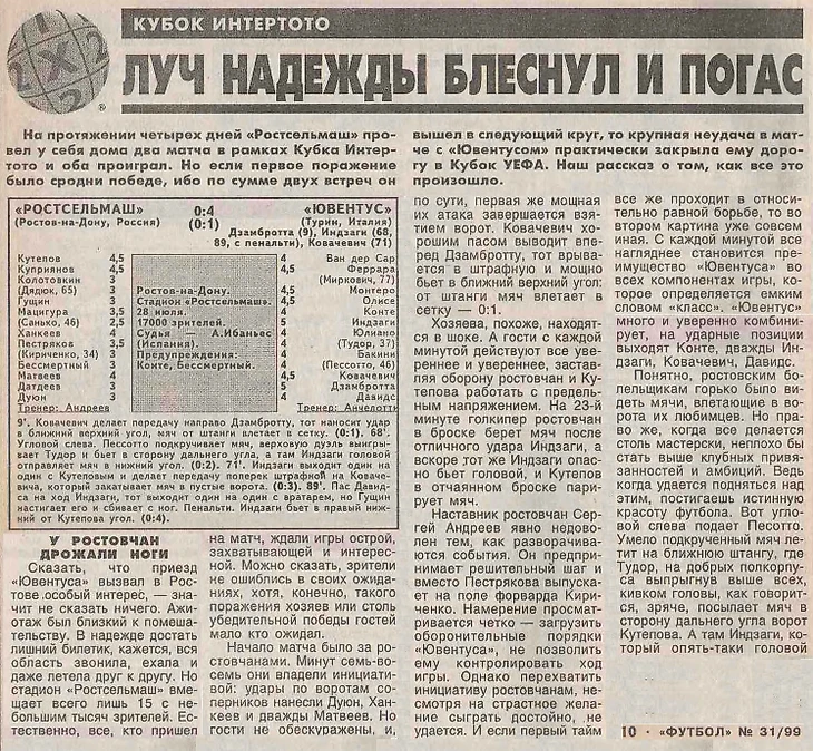 28 июля 1999 года вошел в историю ростовского футбола. В Ростов-на-Дону должен был прилететь туринский Ювентус на матч полуфинала ныне не существующего турнира Кубок Интертото. Для такого маленького клуба, как Ростсельмаш, по меркам Европы сам выход в полуфинал уже был сродни победе, а матч с клубом калибра Юве – главным призом. Ростовчане обыграли до этого македонскую Цементарницу и хорватский Вартекс, к Ювентусу готовились с приличной дозой обреченности. Вероятно, подобное отношение и сказалась на итоговом результате, продемонстрировав разницу отношения к сопернику в сравнении с тем же Локомотивом шестью годами ранее. Игроки Ростова не собирались давать бой, они выходили на поле будто только чтобы посмотреть зарубежный фильм с известными голливудскими звездами. Это неудивительно и нельзя осуждать за такое отношение игроков, но отсутствие даже минимальной борьбы и попыток хотя бы попробовать сыграть в свою игры было очевидно. Но играть все равно пришлось и впереди для обеих команд маячили 180 минут неизвестности.