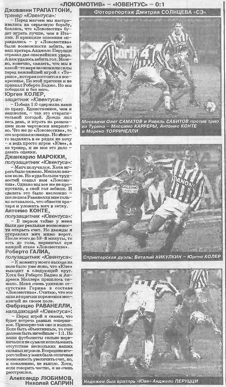 Ювентус преподнес нам много уроков, показал, как вообще играть в футбол, как вести игру. Не секрет, что манера ведения игры итальянских клубов во многом отличается от принятой у нас. Сыграв против Баджо, Раванелли и других звезд, футболисты Локомотива обрели большую уверенность в себе. Если раньше Локомотив заметно побаивался соперников, которые годами считались сильнее его, скажем, Спартака, Динамо, то сейчас робости не испытываем ни перед кем.