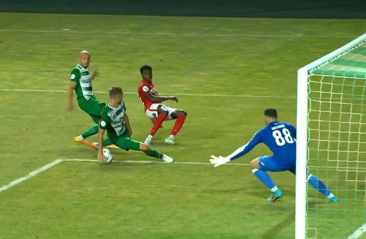 Здесь вопросов быть не может. Это желтая Соболеву и красная Шелие за агрессивное поведение без попытки сыграть в мяч. Безбородов показал только желтую карточку вратарю Ахмата. И это уже ошибка.