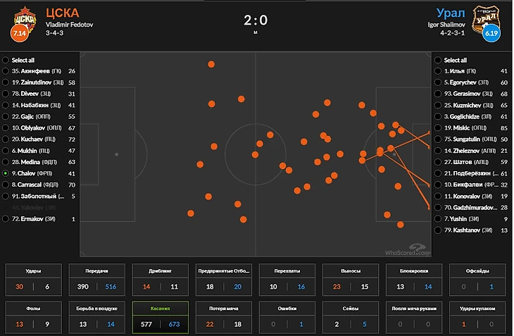 За 70 минут Чалов совершил на поле 41 касание (данные whoscored.com), что не является лучшим результатом в команде (Карраскаль 70, Кучаев 72), но Чалов и не должен быть в первых рядах в своей команде по этому показателю. Наверное интересней будет сравнить его с коллегами по амплуа в других коллективах. К примеру Николсон и заменивший его Соболев в матче Ахмата и Спартака за 90 минут на двоих совершили столько же касаний, Сергеев и Кассьерра за весь матч коснулись мяча всего 22 раза. Вряд ли стоит сильно обращать внимание на этот показатель, но для осознания вовлеченности нападающего в игру команды он будет полезен. Для меня же скорее интересно в каких зонах чаще встречался Фёдор с мячом.