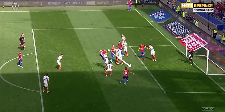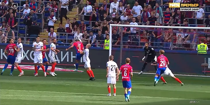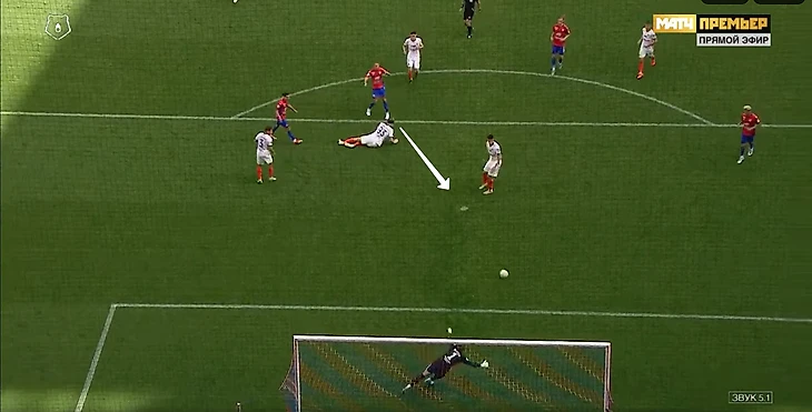 43 минута - нападающий армейцев выигрывает верх после углового и скидывает мяч (или мажет удар) на Кучаева, который не успел подстроиться под мяч и промахнулся мимо ворот.