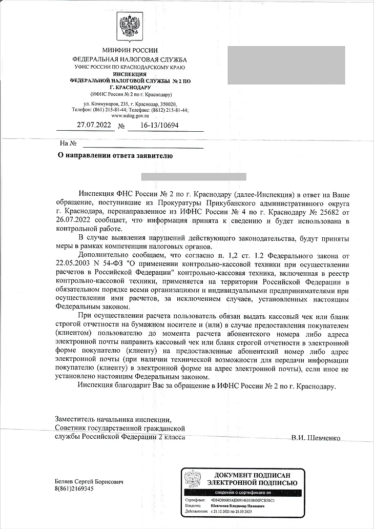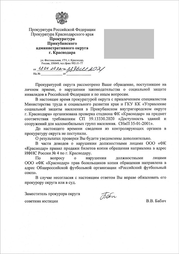 В Инспекцию Федеральной налоговой службы России № 4 по городу Краснодару прокуратурой направлены доказательства продажи билетов инвалидам переводом на личную банковскую карту сотруднику ФК «Краснодар» Георгию Безбедову в сезоне 2021/2022.
