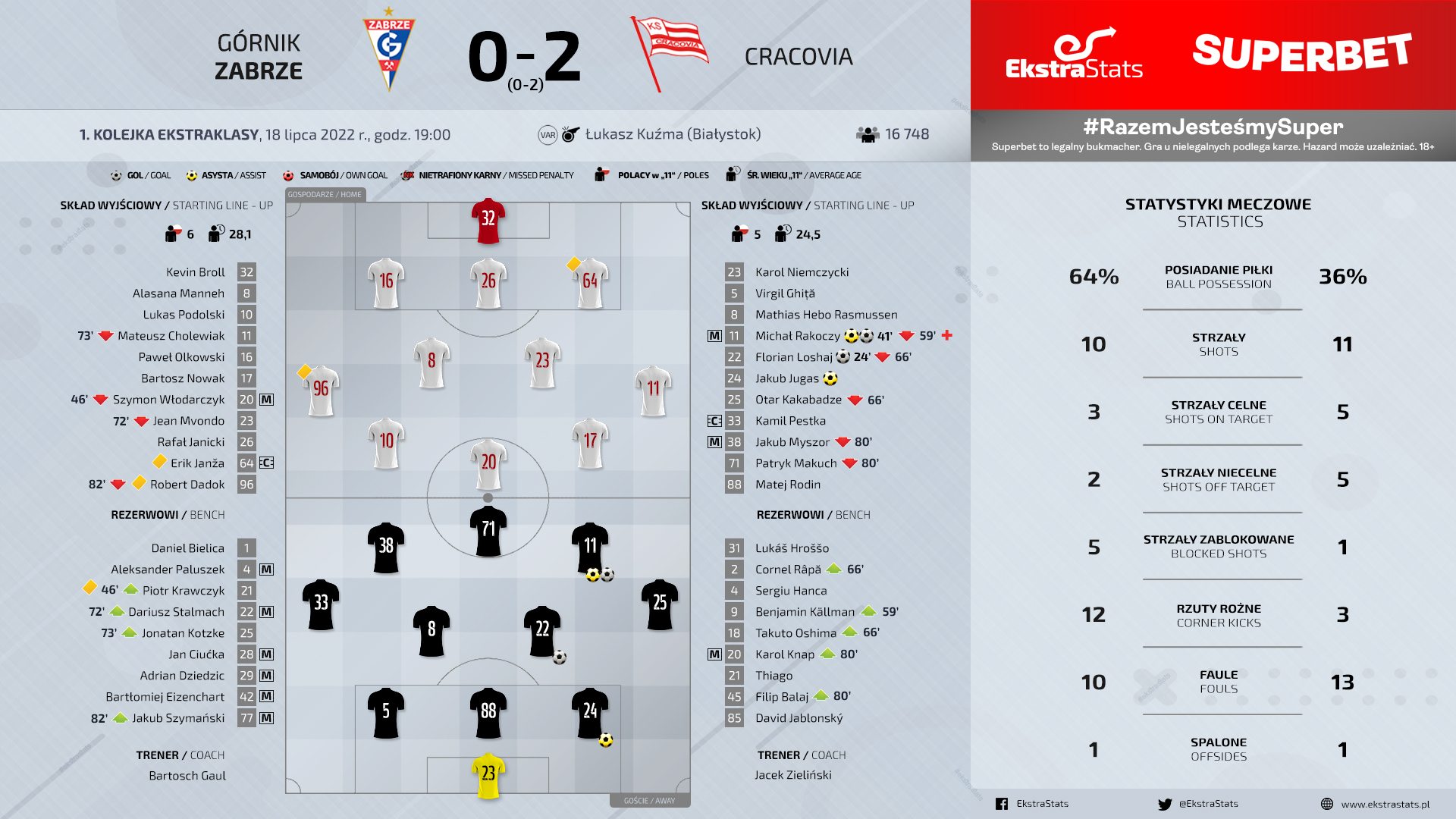 «Краковия» на эти моменты ответила двумя голевыми ударами. В середине тайма молодой Ракочи выкатил мяч Лошаю, который вторым касанием отправил мяч в сетку ворот Бролла, так же дебютировавшего в составе «Гурника». Спустя семнадцать минут Ракочи забил уже сам.